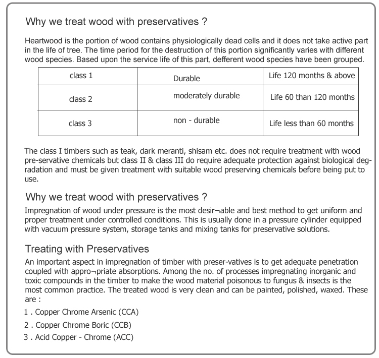 Our products undergo several processes with the help of modern machinery & standard processes. The sophisticated vacuum pressure preservative impregnation process, protects the timber against fungus, termites, borer & other week destroying organisms making it durable and decay proof.