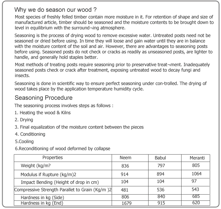 For retention of shape and size of manufactured article and make quality product, timber should be seasoned.